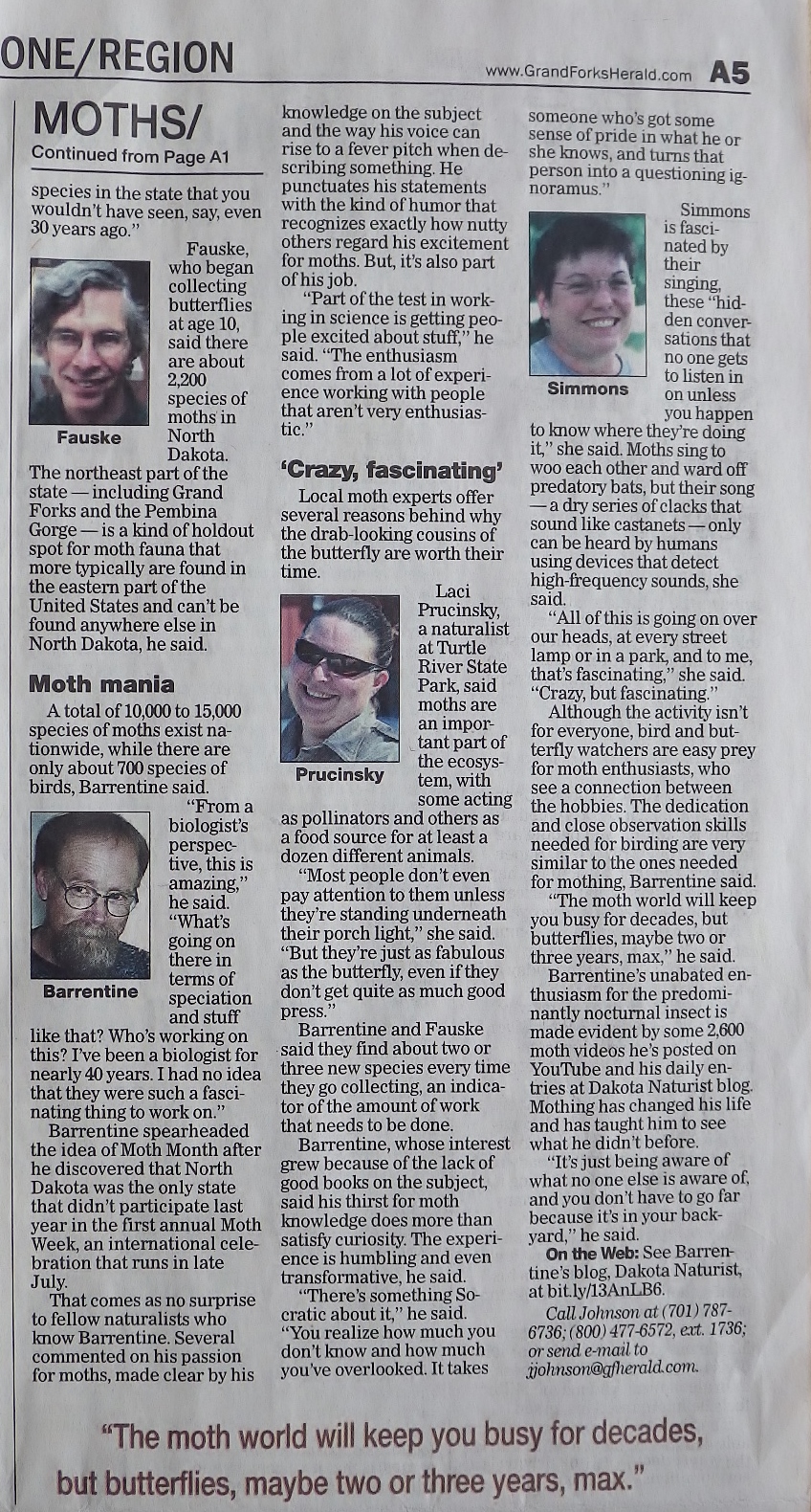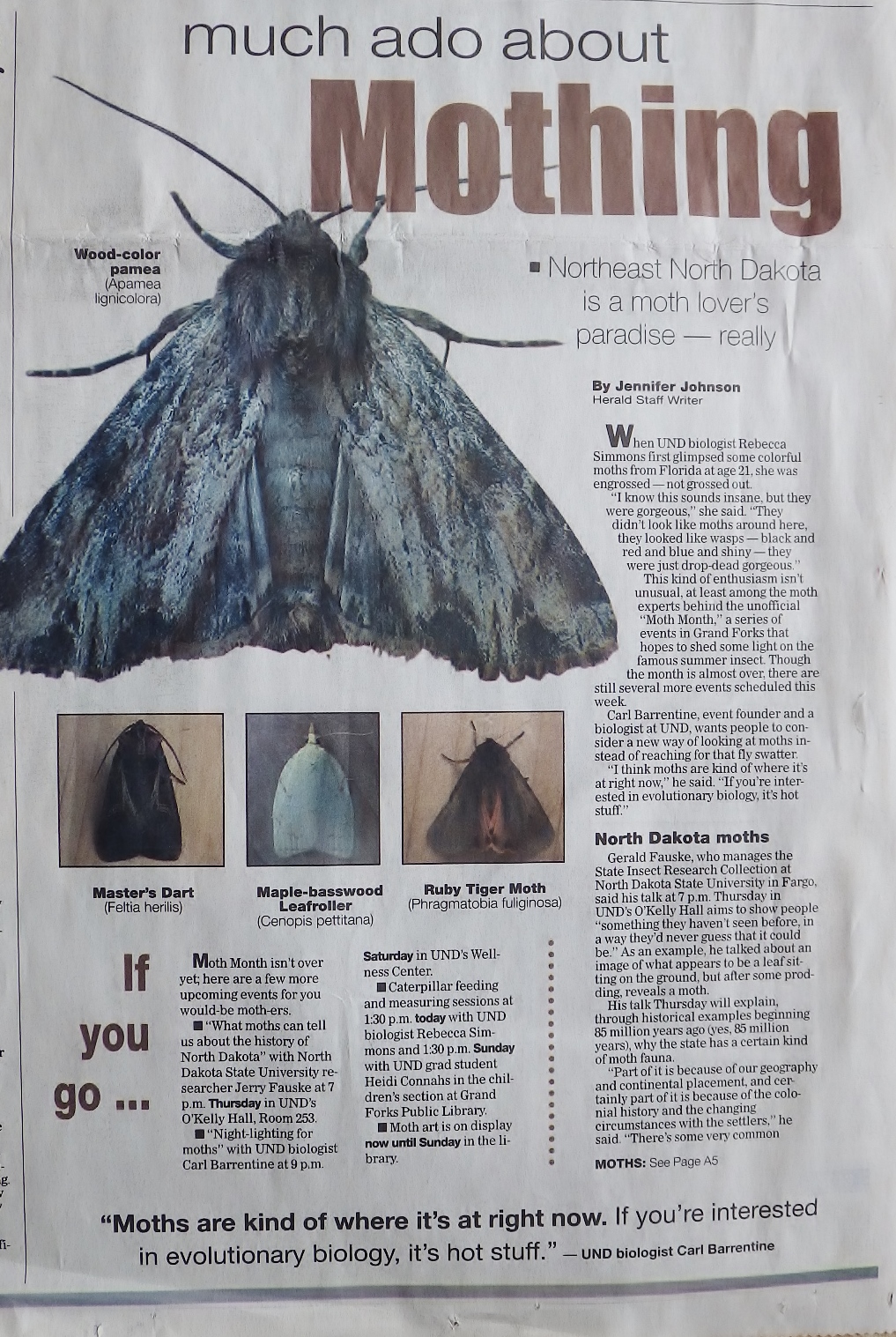 Jennifer Johnson, writer for the Grand Forks Herald, published a story for National Moth Week 2013. This digital reprint of Johnson’s 24 July 2013 article shares the mothing interests of Becky Simmons, Laci Prucinsky, Heidi Connahs, Jerry Fauske, and Carl Barrentine.
