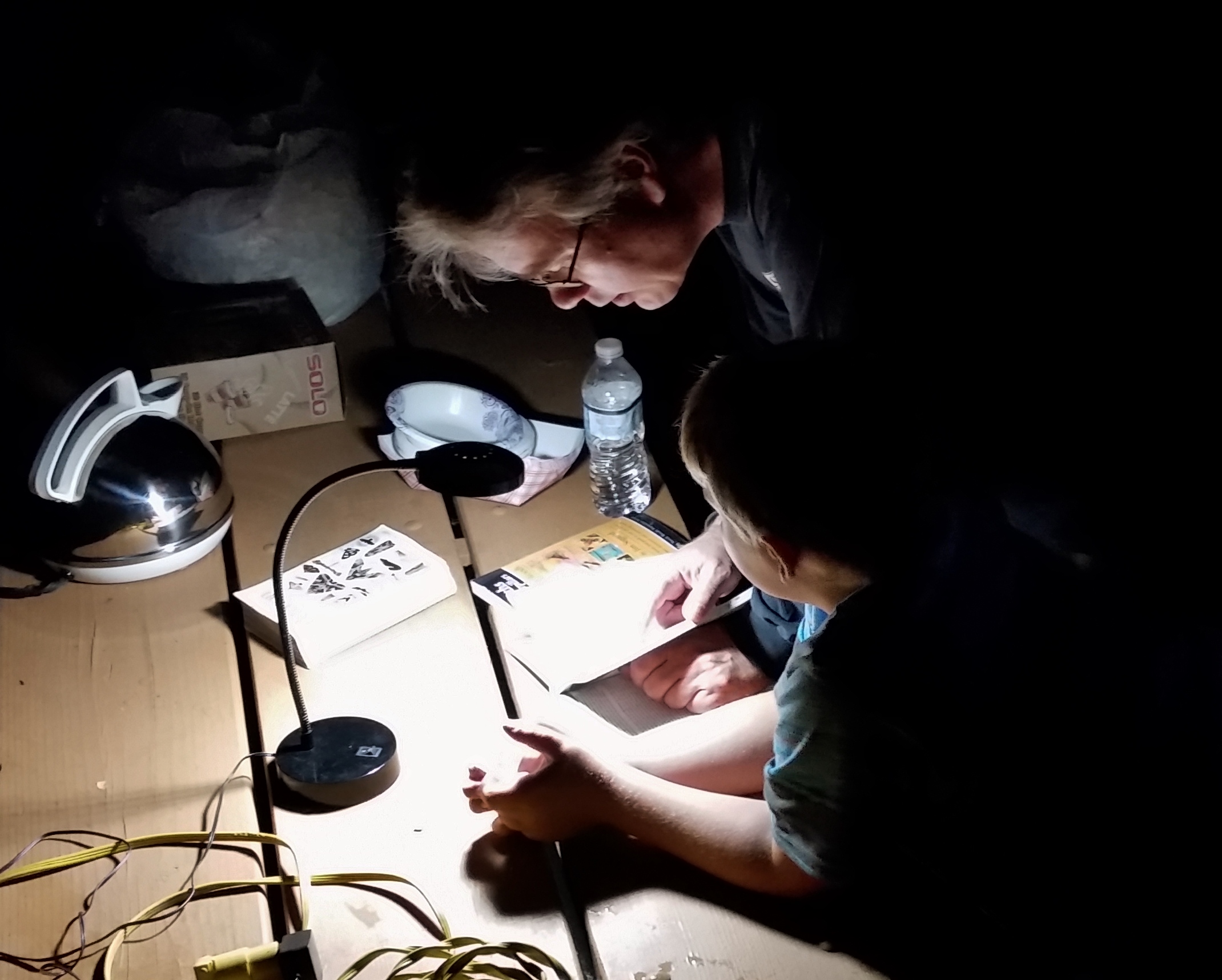 Joe shares a educational moment thumbing through a few field guides to identify a insect with a neophyte entomologist. Turtle River State Park, Arvilla, North Dakota (17 July 2015). Photograph by Sharon Watson.